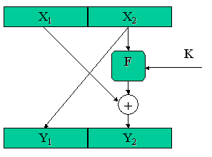 В сети Фейсталя происходит преобразование исходного блока данных. На выходе сети получается преобразованный блок данных. Исходный блок разделяется на две части X1 и X2. Выходной блок данных также состоит из двух частей Y1 и Y2. Чаcть Y1 – это непосредственное значение X2. Значение Y2 является результатов сложения части X1 и результата функции шифрования F. Под функцией шифрования в данном понимается функция от двух аргументов: входного блока данных и секретного ключа. Сама функция представляет собой некоторое не специфицированное преобразование над данными. В сети Фейсталя в качестве аргументов функции шифрования F выступают, входной блок данных X2 и секретный ключ шифрования K.