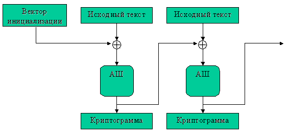 Исходный текст разбивается на блоки. Выбирается так называемый вектор инициализации – несекретная и случайная последовательность бит, по длине равная блоку входящих данных. Первый блок исходных данных складывается с вектором инициализации. Результат сложения поступает на вход алгоритма шифрования. Полученная в результате криптограмма складывается со следующим блоком исходного текста. Результат сложения поступает на вход алгоритма шифрования и так далее.