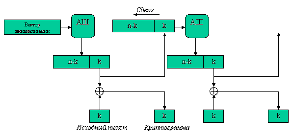 В самом начале вектор инициализации непосредственно поступает на вход алгоритма шифрования. Исходный текст состоит из блоков дины k бит, причем k n, где n - длина входного блока данных. Каждый блок исходного текста складывается с частью последовательности длиной k бит, полученной на выходе из алгоритма шифрования. Результатом сложения является блок шифротекста. Значение последовательности, полученной на выходе из алгоритма шифрования, сдвигается на k бит влево. Самые правые k бит последовательности занимают биты криптограммы. Вновь сформированная таким образом входная последовательность данных поступает на вход алгоритма шифрования и так далее.