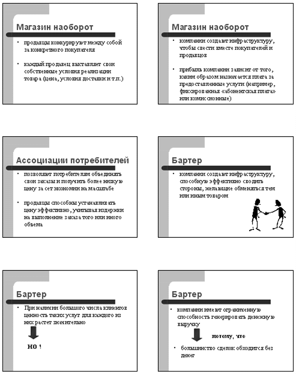 С другой стороны, в структуре систем Интернет-проектов заложена парадигма отношений между субъектами типа "многие - ко многим". Интернет-системы такого типа предоставляют возможность для информационного обмена между многими поставщиками информации, товаров, услуг и т. д. и столь же многочисленными потребителями этой информации, товаров и услуг. Компания - владелец такого Интернет-ресурса чаще всего выступает не как торгово-финансовый "посредник" (т. е. субъект., принимающий на себя часть гарантийных обязательств), а как "агент", предоставляющий сторонам услуги информационного и консультационного характера.