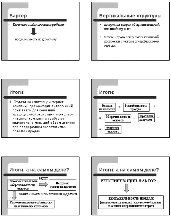 Если Интернет-проект куплен инвестором, то можно считать, что его создатели достигли своей цели, но с точки зрения жизненного цикла проекта, подобная покупка -лишь завершение первого этапа его развития. Вопросы дальнейшего развития встают перед Интернет-проектом на втором этапе, когда его уже купили. Инвесторам необходимо извлечь из него прибыль. Если проект уже стал публичным, то вполне возможно, что инвесторы вернули свои инвестиции с прибылью и вышли (частично или полностью) из него. Но ведь акциями кто-то владеет, и эти кто-то также хотят получить дивиденды. Рост котировок акций возможен, если показана прибыльность бизнеса проекта (теперь уже публичной компании) или устойчивая тенденция роста доходной части проекта. Но собственного бизнеса в нем практически нет, а сугубо рекламный бизнес далеко не всегда в таких проектах является прибыльным (тем более в России, где Интернет-рекламу всегда воспринимали как очень дешевую услугу). Ведь мы знаем, что 70% объема всего рынка рекламных online-услуг в мире сосредоточено на 10 первых рекламных площадках. А как же быть всем остальным?