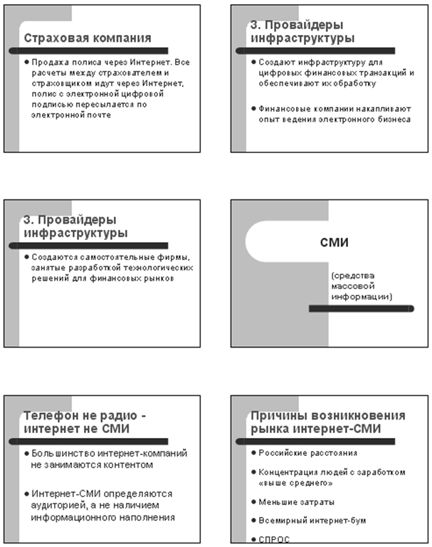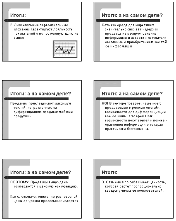 С другой стороны, те Интернет-проекты., которые создавались изначально в рамках парадигмы "один - ко многим" (например, start-up-компания, владеющая Интернет-магазином)., вынуждены или стать конкурентоспособным корпоративным проектом (развившись в offline-бизнес), или уступить место другим компаниям (в первую очередь -серьезным игрокам из offline-бизнеса), создавшим более мощные корпоративные проекты в этом сегменте рынка. Таким образом, все равно произойдет поляризация на корпоративные и Интернет-проекты, и чем быстрее владельцы традиционных компаний, start-up-компаний и Интернет-ресурсов осознают именно свое место в Интернет-бизнесе., тем быстрее и легче они смогут занять место, соответствующее мощности их бизнеса (и их амбициям!).