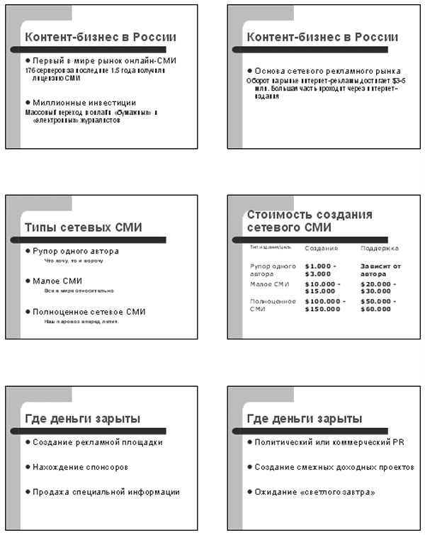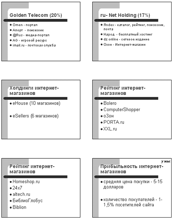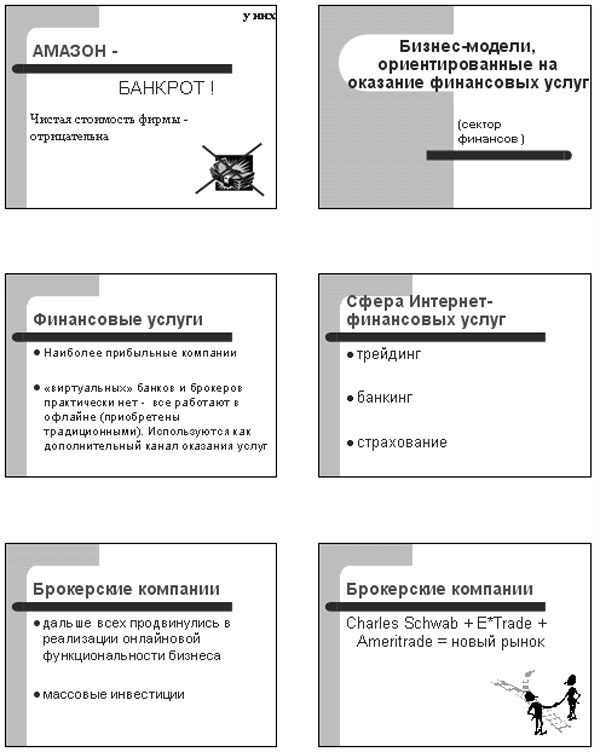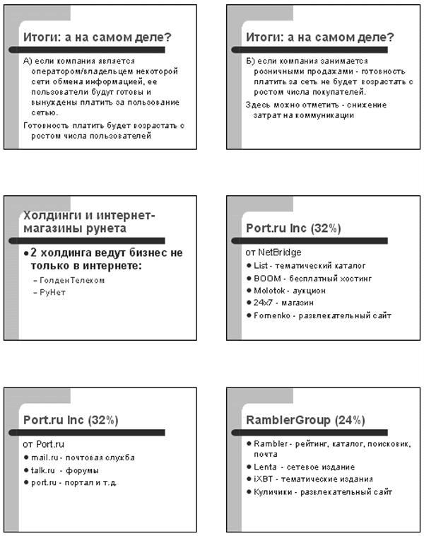 Главные особенности проектов, относящихся ко второй группе, - это, во-первых, их некорпоративный характер, когда в основу проекта ставится не какой-то уже существующий offlme-бизнес, а порождается что-то совсем новое; во-вторых, они интернетовские, то есть существуют именно в Интернете и благодаря Интернету (поэтому в дальнейшем будем обозначать их как Интернет-проекты). Хотя проекты такого рода часто создаются с минимальными затратами буквально "с нуля" несколькими энтузиастами, но на голом энтузиазме проекты такого рода развиваться не могут., так как им необходимы большие рекламные бюджеты. Поэтому основные игроки этой группы -start-up-компании, специально созданные для реализации той или иной Интернет-идеи.