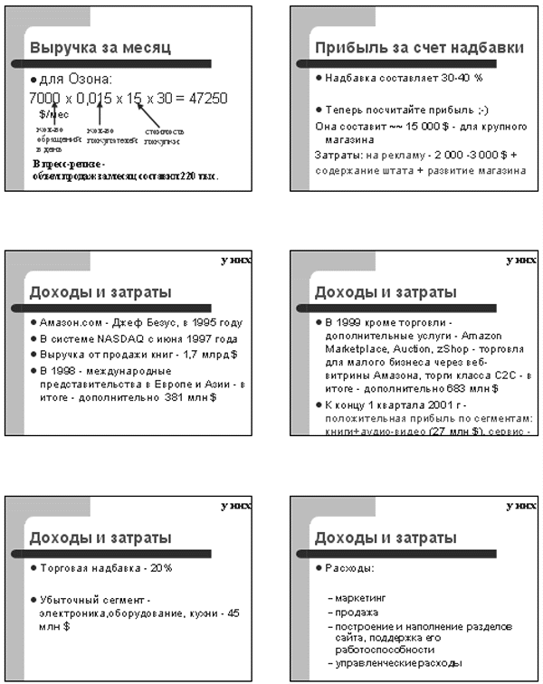Первый заключается в том, что Интернет-проект начинает создавать свой собственный offline-бизнес по образцу традиционных бизнес-схем компаний аналогичного профиля деятельности. Например, книжный магазин обзаводится складом (складами), развивает курьерскую и транспортную службу и нанимает соответствующий квалифицированный штат обслуживающего персонала. "С нуля" это сделать очень сложно по очень простой причине - рост объемов продаж для раскрученного Интернет-проекта чаще всего оказывается больше, чем темпы наращивания мощности обслуживающих ресурсов для соответствующей offlme-деятельности. Кроме того, offline-игроки не дремлют и не допускают конкурента в offline-сегмент рынка. Поэтому наиболее правильной стратегией создания offline-бизнеса для Интернет-проекта является покупка какой-либо ofnine-компании, соответствующей профилю вашей деятельности. Практически все известные зарубежные Интернет-проекты пошли по этому пути развития.