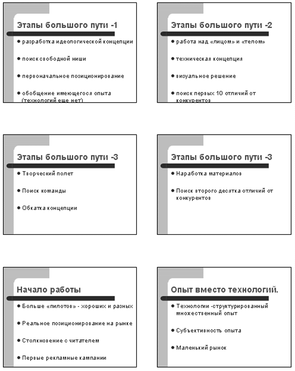 1. Сначала разрабатывается стратегия присутствия в Интернете. Это самый ответственный этап, за рубежом это давно уже поняли и уделяют первому этапу пристальное внимание - привлекают для разработки стратегии консультантов, обращаются к фирмам-ресечерам за результатами маркетинговых исследований различных сегментов Интернет-рынка.