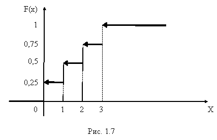 График функции распределения для дискретной случайной величины представляет собой ступенчатую разрывную линию, непрерывную слева (рис. 1.7).
