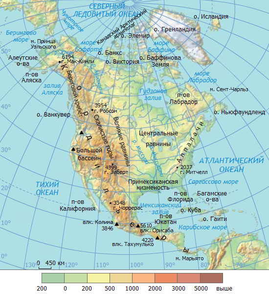 На востоке материка расположены невысокие горы Аппалачи. Вдоль западного побережья протянулись Кордильеры. Они расчленены глубокими речными долинами, каньонами. Самая высокая вершина – Мак-Кинли (6194 м). Кордильеры образовались на стыке литосферных плит. Движения земной коры в этом районе приводят к сильным землетрясениям и вулканизму.