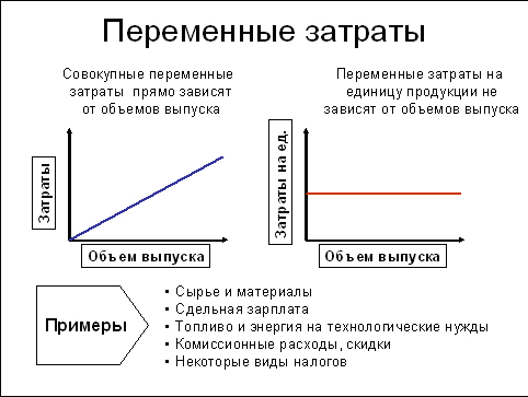 Переменные затраты (variable costs) изменяются более или менее пропорционально изменениям объема производства (рис. 2). К ним относятся: материалы, сдельная оплата основных рабочих, электроэнергия на технологические нужды, комиссионные, горючее для транспорта, заготовительные расходы и др.