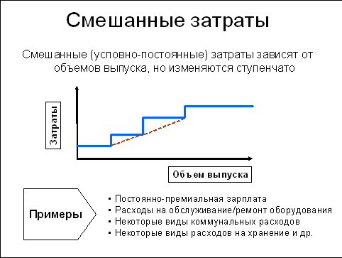 Основными типами затрат, каждый из которых определяется в зависимости от того, меняются ли они в ответ на колебания объема производства, являются переменные, постоянные и смешанные.