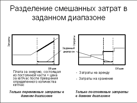 В целях упрощения анализа обычно исходят из допущения о пропорциональной зависимости переменных затрат от объемов деятельности. Однако, как следует из рисунка, переменные затраты на единицу конкретного вида продукции не зависят от объемов ее производства и остаются постоянной величиной до определенного предела.