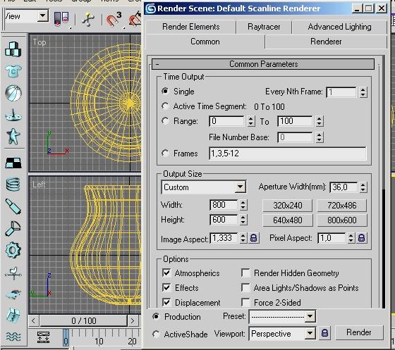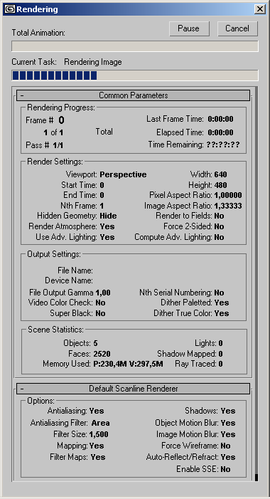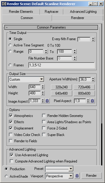 В диалоговом окне Render Scene раздел «Размер изображения на выходе» (Output Size) определяет разрешение визуализируемого изображения по ширине и высоте в пикселях. По умолчанию установлено разрешение 640x440. Щелчком по кнопке примените команду Render Scene (Рис. 6.74).