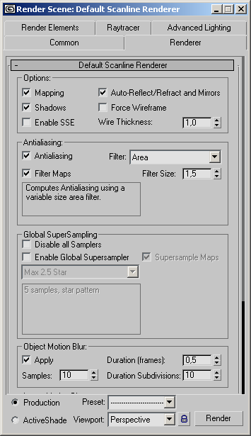 Свиток Default Scanline Renderer предназначен для настройки параметров, присущих только построчному визуализатору.
