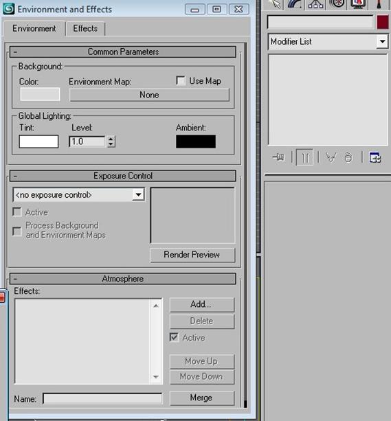 Для добавления эффектов в трехмерную сцену требуется выполнить команду «Визуализация» (Rendering) – «Эффекты» (Effects), а затем перейти на вкладку «Эффекты» (Effects). В окне «Окружение и эффекты» (Environment and Effects) нажмите кнопку «Добавить» (Add) и выберите нужный эффект. После добавления эффекта ниже в окне «Окружение и эффекты» появятся настройки эффекта.
