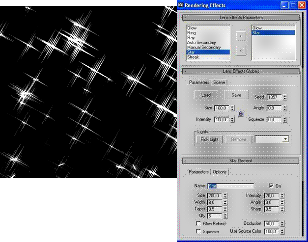 Используя параметры свитка «Общие параметры эффектов линзы» (Lens Effects Globals), можно выбирать источник света, к которому будут применяться эффекты. Источник можно указать, нажав кнопку «Указать источник света» (Pick Light) и выделив его в сцене.