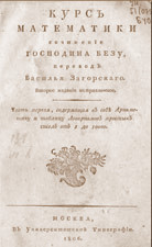 Безу Э. Курс математики. В 4 ч. Ч. 1. Арифметика / Э. Безу; пер. В. Загорского. — 2-е изд., испр. — М.: Университетская типогр., 1806. — 198 с. + табл. |