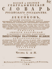 Дополнительная информация. Полное название: «Новый и полный географический словарь Российскаго государства, или Лексикон, Описующий азбучным порядком, географически, топографически, идрографически, политически, хронологически, генеалогически и гералдически, Наместничества, области и уезды; города, крепости, редуты, форпосты, остроги, ясашныя зимовья, станицы, местечки, села, погосты, ямы и слободы; соборы, церкви и монастыри; рудные и другие заводы и фабрики; реки, озера и моря; острова и горы; прежния и новыя иностранныя поселения; обитателей как природных российских, так и других народов, и прочия достопамятныя места обширной Империи Российской в нынешнем ея состоянии, в царствование императрицы Екатерины Великия новоустроенном; С объяснением и тех мест, которыя в прежния войны и прошедшую Турецкую; а некоторыя прежде того и от Персии храбростию российскою или обладаемы были, или и ныне находятся еще во владении; также и тех, которыя в преславное настоящее царствование с Белоруссиею и с полуостровом Крымом к России присоединены; Из достопамятных и достоверных древних и новых источников собранный»