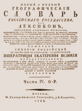 Дополнительная информация. Полное название: Новый и полный географический словарь Российскаго государства, или Лексикон, Описующий азбучным порядком, географически, топографически, идрографически, политически, хронологически, генеалогически и гералдически, Наместничества, области и уезды; города, крепости, редуты, форпосты, остроги, ясашныя зимовья, станицы, местечки, села, погосты, ямы и слободы; соборы, церкви и монастыри; рудные и другие заводы и фабрики; реки, озера и моря; острова и горы; прежния и новыя иностранныя поселения; обитателей как природных российских, так и других народов, и прочия достопамятныя места обширной Империи Российской в нынешнем ея состоянии, в царствование императрицы Екатерины Великия новоустроенном; С объяснением и тех мест, которыя в прежния войны и прошедшую Турецкую; а некоторыя прежде того и от Персии храбростию российскою или обладаемы были, или и ныне находятся еще во владении; также и тех, которыя в преславное настоящее царствование с Белоруссиею и с полуостровом Крымом к России присоединены; Из достопамятных и достоверных древних и новых источников собранный