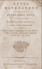 Безу Э. Курс математики. В 4 ч. Ч. 1. Арифметика / Э. Безу; пер. В. Загорского. — 2-е изд., испр. — М.: Университетская типогр., 1806. — 198 с. + табл. |