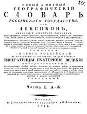 Дополнительная информация. Полное название: «Новый и полный географический словарь Российскаго государства, или Лексикон, Описующий азбучным порядком, географически, топографически, идрографически, политически, хронологически, генеалогически и гералдически, Наместничества, области и уезды; города, крепости, редуты, форпосты, остроги, ясашныя зимовья, станицы, местечки, села, погосты, ямы и слободы; соборы, церкви и монастыри; рудные и другие заводы и фабрики; реки, озера и моря; острова и горы; прежния и новыя иностранныя поселения; обитателей как природных российских, так и других народов, и прочия достопамятныя места обширной Империи Российской в нынешнем ея состоянии, в царствование императрицы Екатерины Великия новоустроенном; С объяснением и тех мест, которыя в прежния войны и прошедшую Турецкую; а некоторыя прежде того и от Персии храбростию российскою или обладаемы были, или и ныне находятся еще во владении; также и тех, которыя в преславное настоящее царствование с Белоруссиею и с полуостровом Крымом к России присоединены; Из достопамятных и достоверных древних и новых источников собранный»