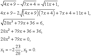 , что могло привести к появлению посторонних корней (такой вывод позволяет сделать определенная искусственность этого приема). Поэтому проверим все найденные корни непосредственной подстановкой в исходное уравнение.