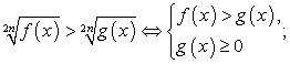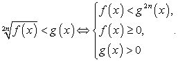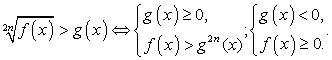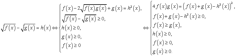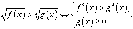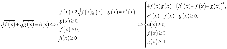 Комментарий. Рассмотрим далее несколько примеров решения иррациональных неравенств. Все они, как мы уже обсуждали, решаются применением исключительно равносильных преобразований. Поэтому приведем схемы основных равносильных переходов (