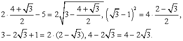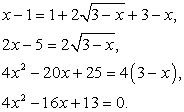 не имеет смысла при x = -0,5. Поэтому единственный возможный корень исходного уравнения — это х = 2, удовлетворяющий всем условиям области определения. Поскольку, возводя обе части уравнения в квадрат, мы всякий раз соблюдали условие равносильности, то х = 2 — единственный корень исходного уравнения.