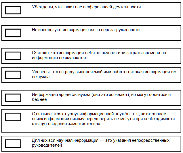 Даны характеристики групп «непотребителей» информации. Подберите каждой характеристике название, соответствующее группе. Вставьте номер названия в соответствующий прямоугольник.